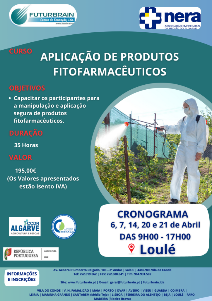Neste âmbito, o NERA, em parceria com a Futurbrain – Centro de Formação, Lda., promove a ação de formação Aplicação de Produtos Fitofarmacêuticos (35 horas), destinada a capacitar os participantes para a utilização segura e responsável destes produtos, de acordo com os princípios da proteção integrada.