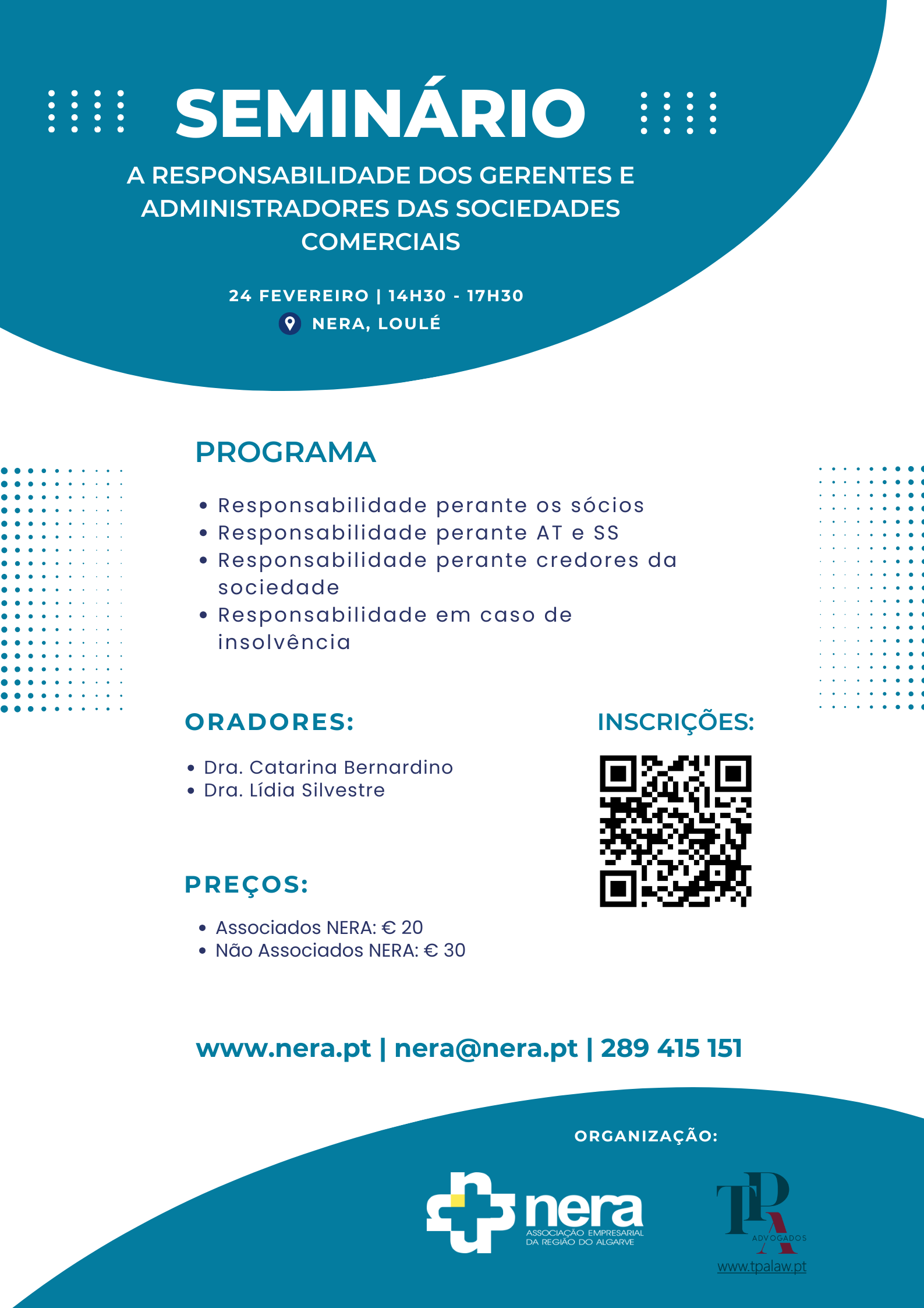 No âmbito da parceria estabelecida entre o NERA – Associação Empresarial da Região do Algarve e a TPA – Teresa Patrício & Associados, Sociedade de Advogados, vimos pelo presente informar V. Exa. sobre a realização do Seminário dedicado ao tema “A Responsabilidade dos Gerentes e Administradores das Sociedades Comerciais” que terá lugar no próximo dia 24 fevereiro, pelas 14h30m, nas instalações do NERA, em Loulé.