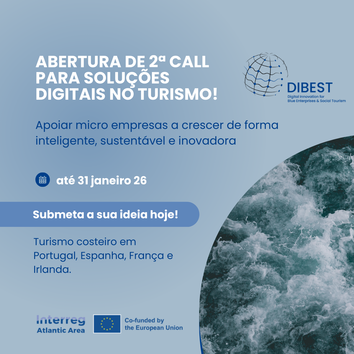 O projeto internacional DIBEST – Inovação Digital para a Economia Azul e Turismo Social, é cofinanciado pelo programa Interreg Espaço Atlântico, através do Fundo Europeu de Desenvolvimento Regional, e opera nas regiões costeiras de Espanha, França, Irlanda e Portugal. O projeto tem término previsto para julho de 2026. O seu objetivo é apoiar as microempresas do turismo costeiro na adoção de inovações digitais que reforcem a sua sustentabilidade social, ambiental e económica.